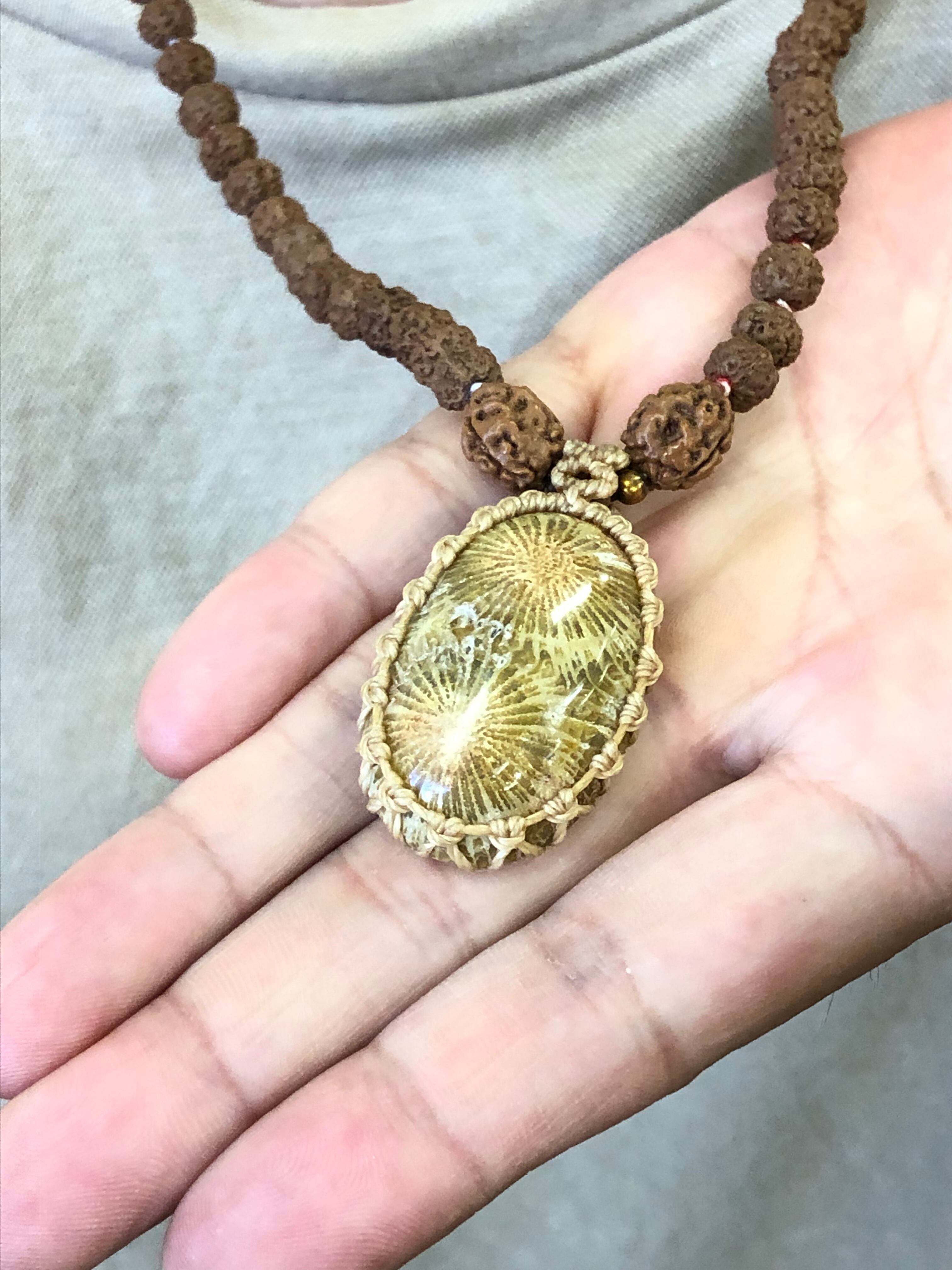 「インドネシア産」の「フォシルコーラル(珊瑚の化石)」をマクラメ加工し、ペンダントトップにした108粒のマーラーです。