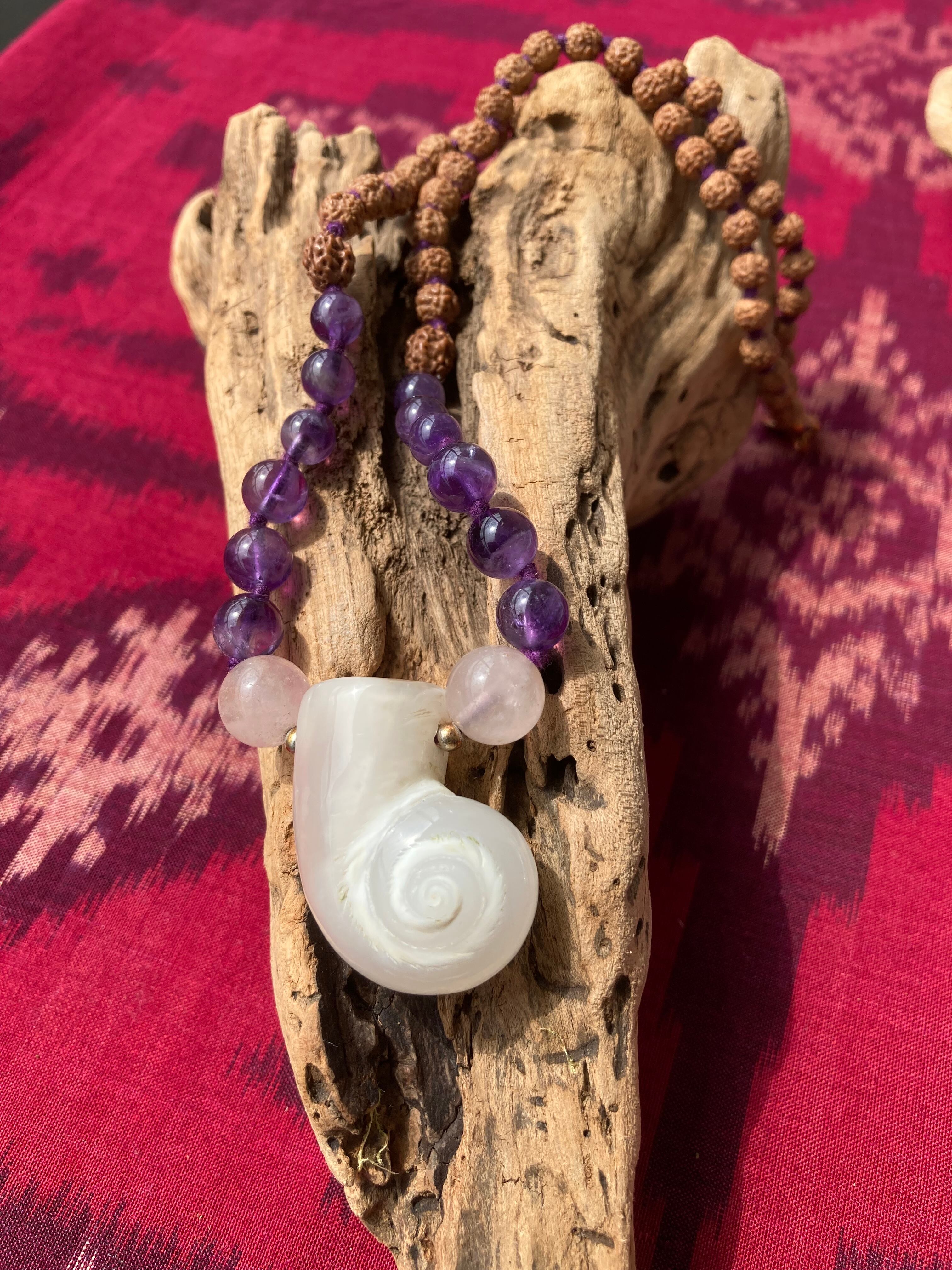 ルドラクシャ&アメジスト&ローズクォーツのネックレスです。