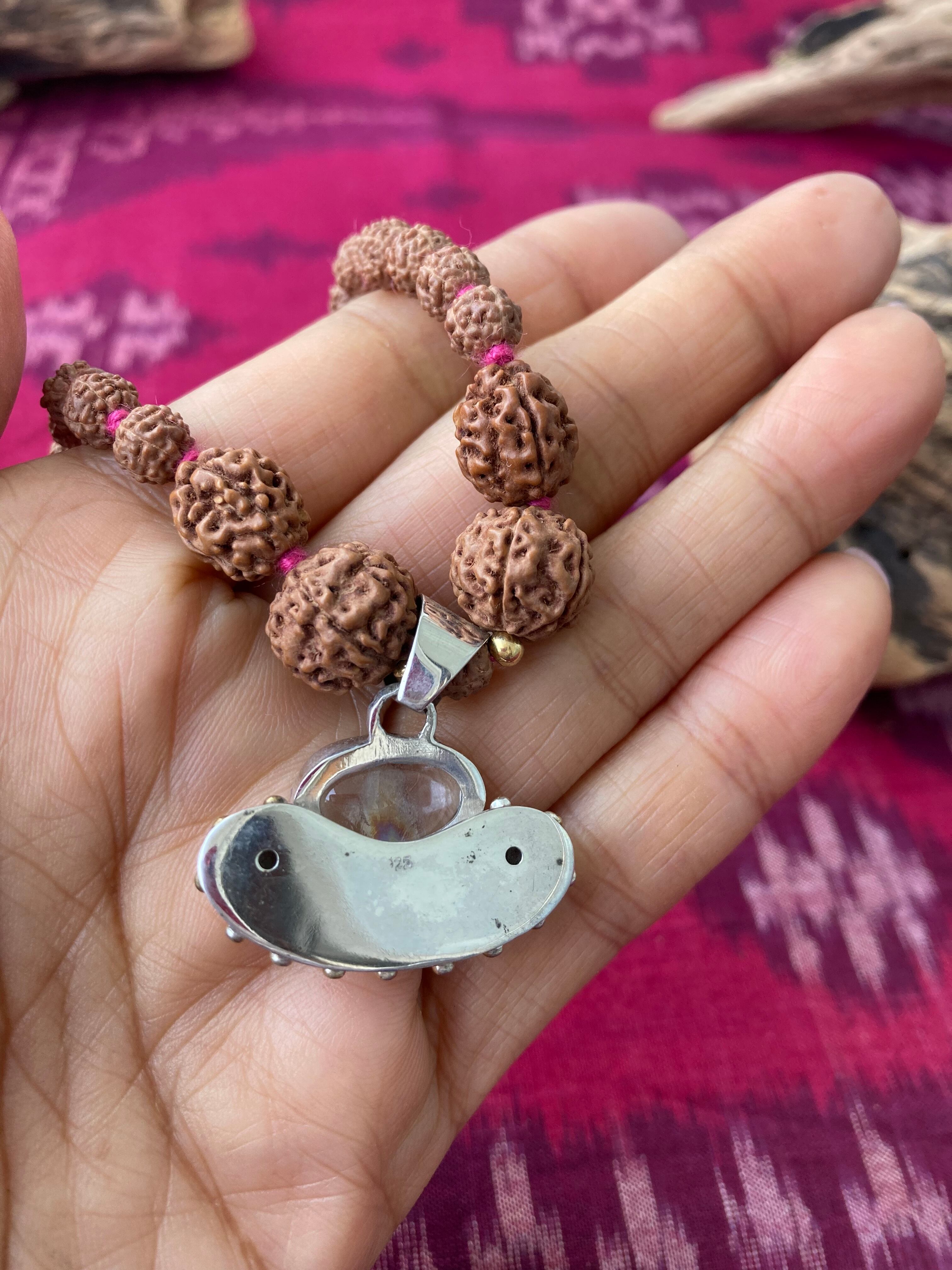 ★ルドラクシャ5面(約7mm)・ルドラクシャ4面(約縦8mm)・ルドラクシャ6面(約11mm)・クリスタル水晶(約8mm)・インドネシア産アイリス入り水晶(約15mm×約10mm:シルバー925)・24Kコーテイング925シルバービーズ(約4mm)